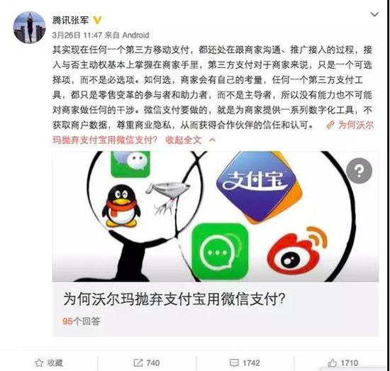 对于此事,腾讯公关总监张军在微博上回应此事:其实现在任何一个第三方移动支付,都还处在跟商家沟通、推广接入的过程,接入与否主动权基本上掌握在商家手里。第三方支付对于商家来说,只是一个可选择项,而不是必选项。如何选,商家会有自己的考量,任何一个第三方支付工具,都只是零售变革的参与者和助力者,而不是主导者,所以没有能力也不可能对商家做任何的干涉。