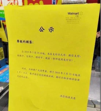 3月23日晚间,重庆地区一消费者最先曝出沃尔玛超市不能用支付宝而只能用微信支付。该用户贴出的一张超市店内公示显示:“自2018年3月15日开始,本店支付方式为:微信支付、银联卡、信用卡、预付卡、现金(暂停使用支付宝)。同时,为回馈广大消费者,将于2018年3月15日起至4月1日止,展开微信支付满减活动,届时具体活动详情见店内公告。”