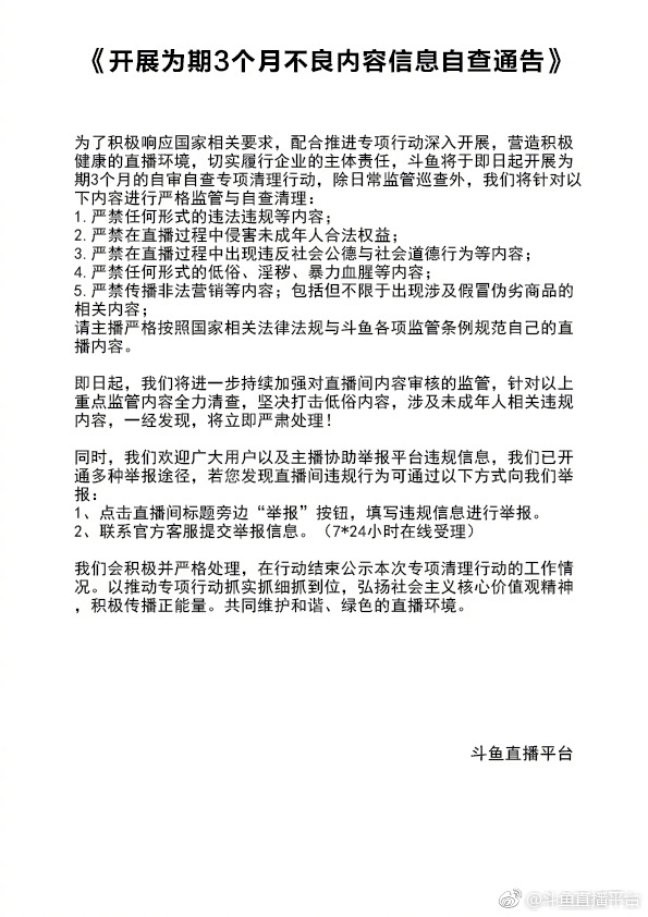 斗鱼称,除了日常监管巡查外,还将针对违法违规内容、直播过程中侵犯未成年人合法权益、直播过程中出现反社会公德与社会道德行为内容、低俗淫秽内容、非法营销内容等进行监管与自查清理。