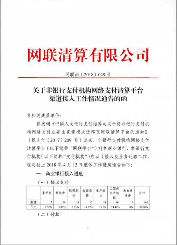 经济观察网 李意安 上海报道 4月16日,网联各成员机构收到了网联清算有限公司发布(下文简称“网联”)的《关于非银行支付机构网络支付清算平台渠道接入工作情况通告的函》(网联函【2018】049号)。文件显示了462家商业银行和115家支付机构的接入进度。