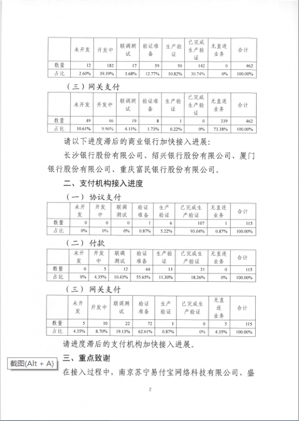 除此以外,文件显示,商业银行协议支付完成生产验证的比例达到74.46%,付款接入完成生产验证的比例达到30.74%,支付机构的这两组数据分别为93.04%和18.26%。但外界最为关注的网关支付,商业银行“无直连业务”的比例已经达到73.38%,支付机构这一数据仅为4.35%,大幅落后于商业银行。