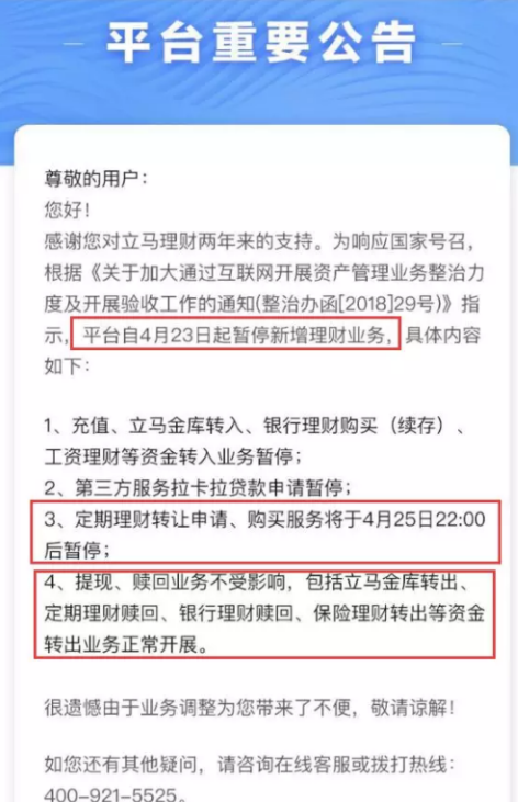 1. 充值、立马金库转入、银行理财购买(续存)、工资理财等资金转入业务暂停;