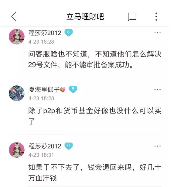 在立马理财的百度贴吧里,关于这个公告的持续效应仍在继续,多数买了定期产品的投资者情绪比较担忧。