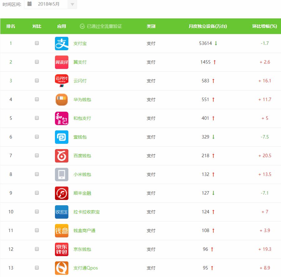 根据艾瑞网公布的最新《艾瑞APP指数》,根据月度独立设备数,2018年5月份月活排名靠前的支付类APP如下:
