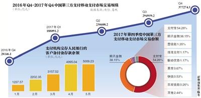 在移动支付市场上,支付宝和拥有财付通、微信支付的腾讯金融双寡头局势显现。今年4月,易观2017年第四季度中国第三方支付移动支付市场数据显示,第三方移动支付市场交易规模为37.7万亿元,环比增长27.91%。其间支付宝和腾讯金融两巨头的份额分别为54.26%和38.15%,合计92.41%。