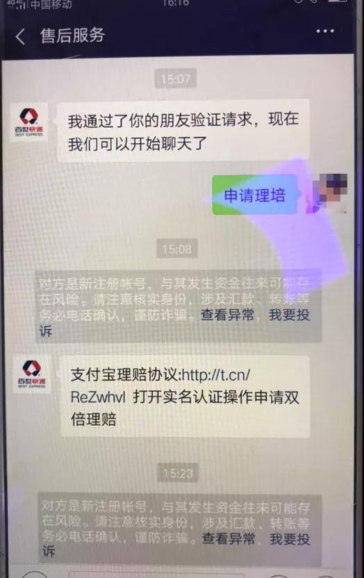 “我是百世快速售后服务,抱歉地告诉您,您的快递经我们核实,已经遗失了,您看,我们是一赔三给您,还是原物还您?”