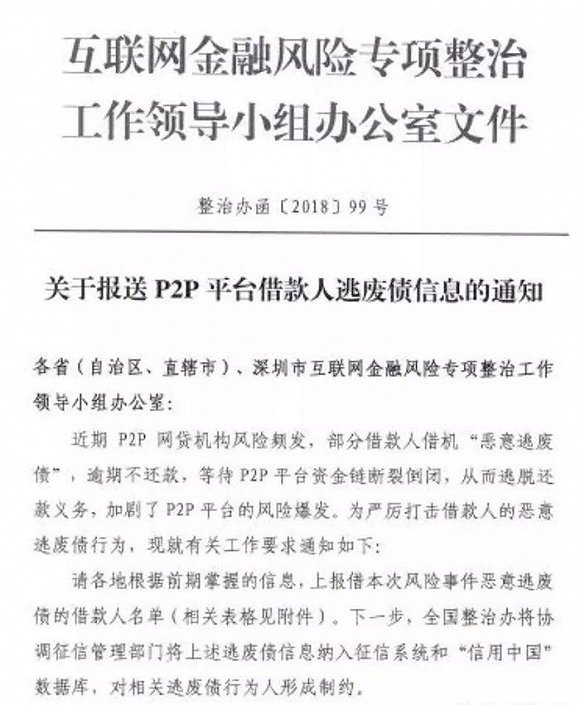 通知称,近期P2P网贷机构风险频发,部分借款人借机“恶意逃废债”,逾期不还款,等待P2P平台资金链断裂倒闭,从而逃脱还款义务,加剧了P2P平台的风险爆发。