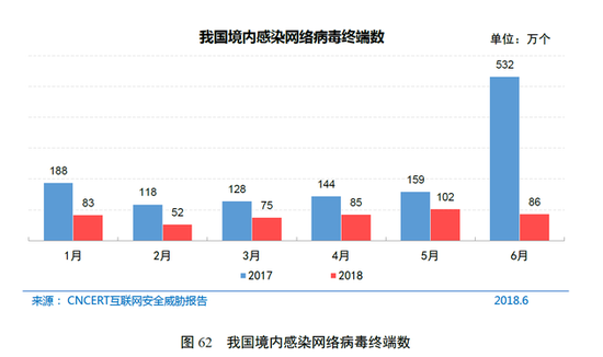 2018年上半年CNCERT共监测发现我国境内感染网络病毒[1]终端[2]累计483万个,相比2017年同期的1269万个下降61.9%。
