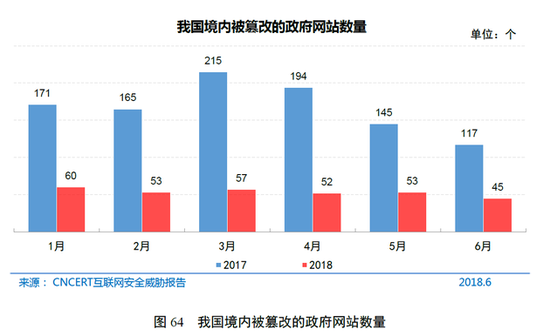2018年上半年CNCERT共监测发现我国境内被篡改政府网站[1]数量累计320个,较2017年同期的1007个下降68.2%。