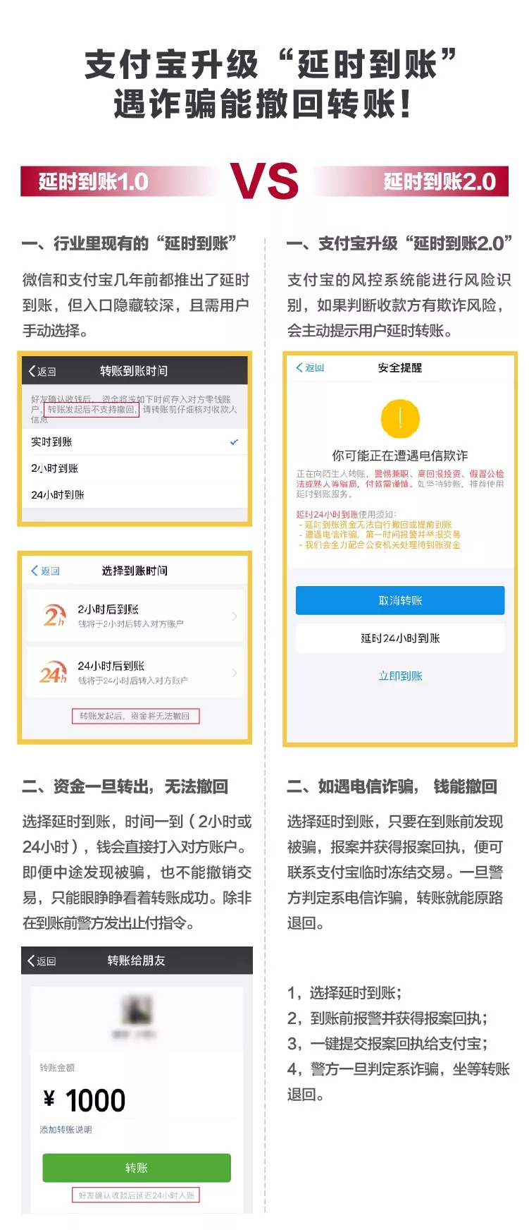 8月21日,在2018网络安全生态峰会上,蚂蚁金服集团副总裁芮雄文宣布支付宝的延时到账升级为2.0:如果遭遇诈骗,只要延时转账还未到账,及时报警就能冻结交易,一旦警方下达止付指令,转账就能原路退回。