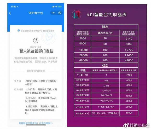 腾讯安全中心的守护者计划小程序显示,KCI文化链已被839人标记,并且1.1.1所示的微信证据,可以明显看出来该项目具备入门费、拉人头、团队计酬三大特征,为典型的传销诈骗。