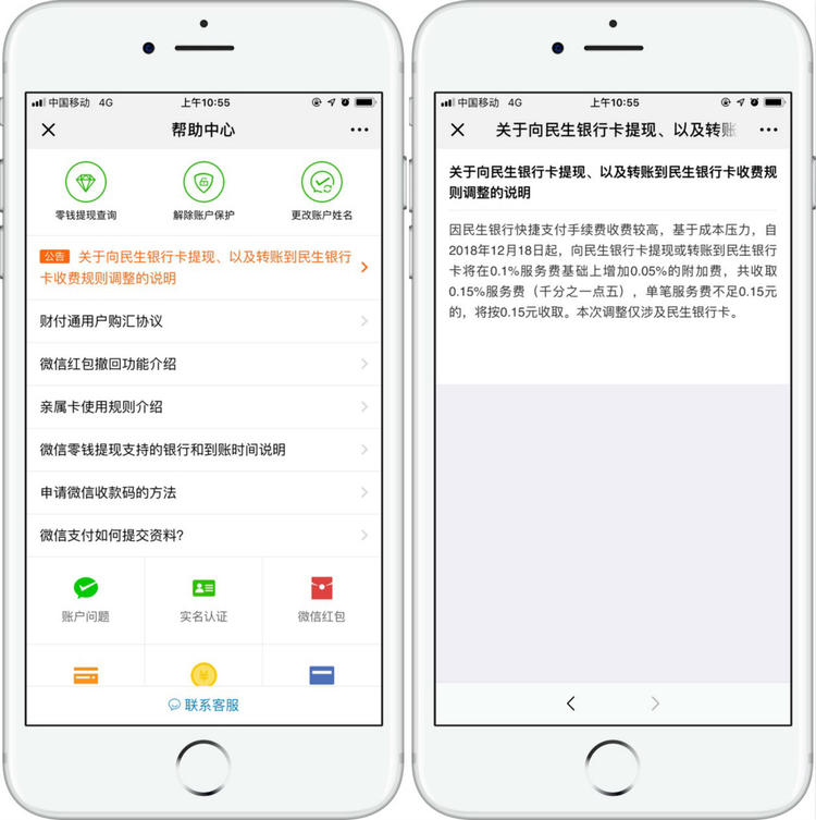 微信对此的解释是:“民生银行快捷支付手续费收费较高,基于成本压力作出调整。”