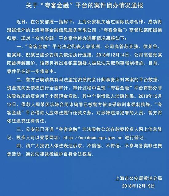 此前,根据上海公安局黄埔分局通报,今年8月21日,夸客金融法人代表郭某来黄浦公安局投案,交代了其通过网上理财平台高息非法吸收公众存款的犯罪事实,该分局于当天对该案展开侦査,并对法人代表郭某、高管陈某等6人采取刑事强制措施。
