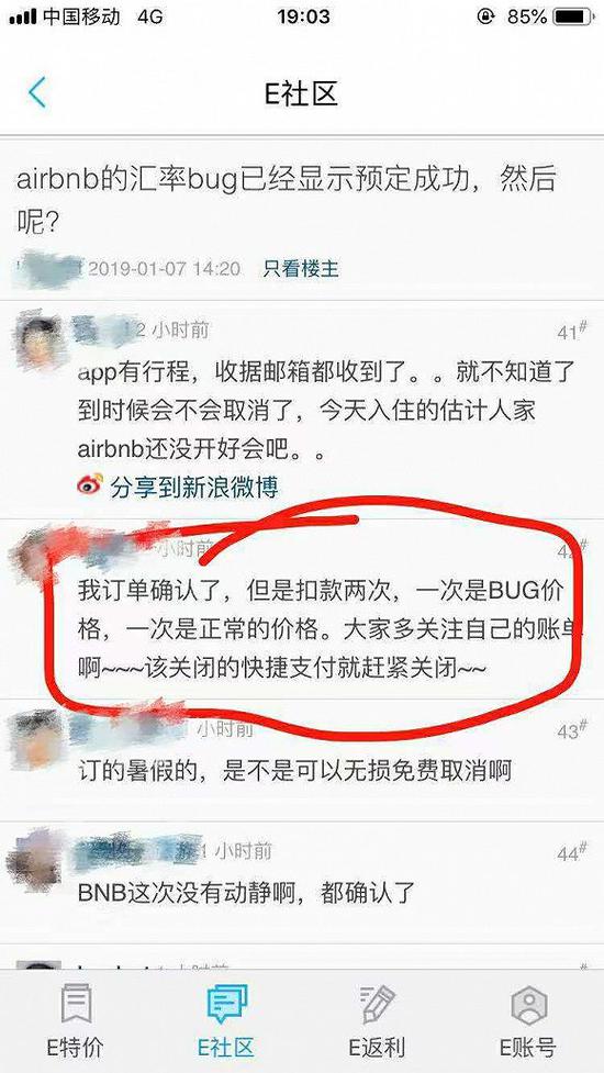 “7日中午12时左右,网上传出爱彼迎出现bug的消息,好多人去App上试着下单,不到两点的时候,这个bug就逐步修复了。”在旅游消息群的彭先生告诉界面新闻,他自己试订了一间山东某地的公寓,三个晚上价格一百欧元,最终用一百元人民币进行了支付。