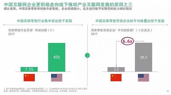通过分析中美零售连锁百强企业,BCG发现,中国互联网企业对线下实体零售的影响力更大。报告显示,受中国互联网公司投资的零售连锁百强企业,他们的销售额占中国零售强企业销售总额的28%,而这一比例在美国零售百强企业中只有0.8%。