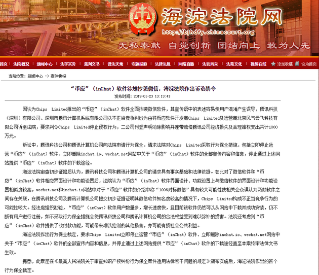 海淀法院作出行为保全裁定,要求Chips Limited立即停止运营“币应”(inChat)软件、立即删除inchat.io、wechat.net网站中关于“币应”(inChat)软件的全部宣传内容和信息,并停止通过上述网站提供“币应”(inChat)软件的下载途径直至本案终审法律文书生效。