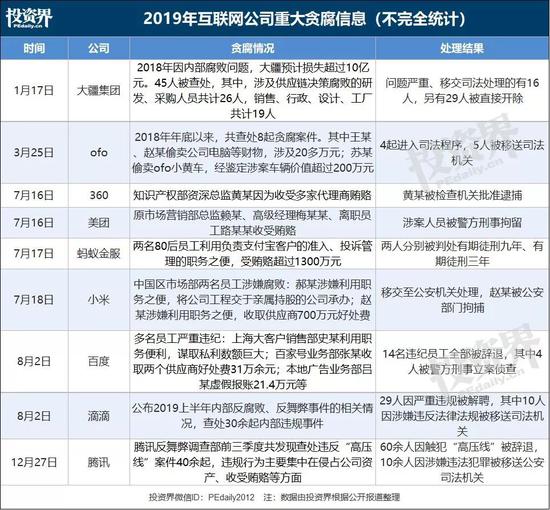 一个触目惊心的事实摆在眼前:互联网公司贪腐屡见不鲜。投资界(ID:pedaily2912)梳理2019年互联网公司披露的重大贪腐信息如下: