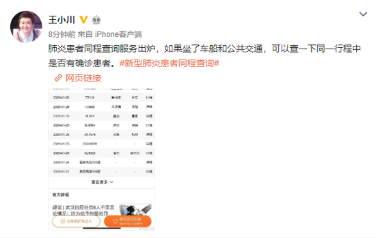 此外,搜狗CEO王小川在微博表示,肺炎患者同程查询服务出炉,如果坐了车船和公共交通,可以查一下同一行程中是否有确诊患者。