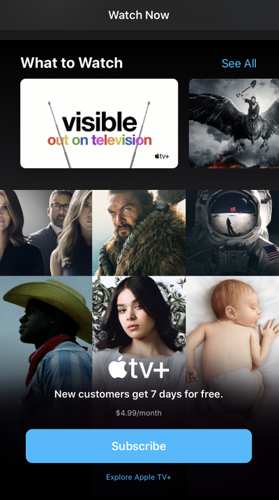 尽管用户可在 Apple TV 上欣赏租赁获购买的各类电影和电视节目,但在点击了‘立即观看’并往下滚动一页之后,依然逃不过“新客 7 天免费,月费 4.99 美元”的订阅推广信息。