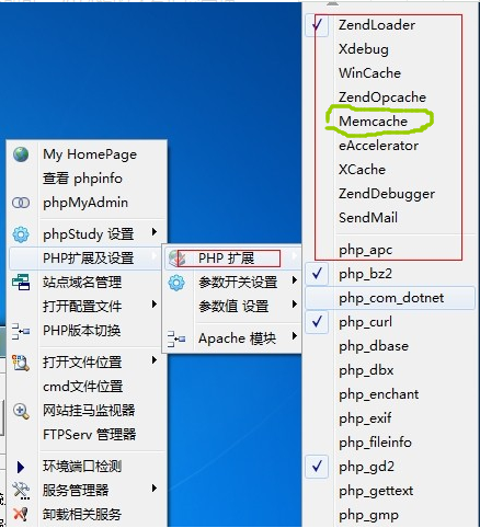 在phpStudy2014版中的php扩展中有memcache项,勾选即可.